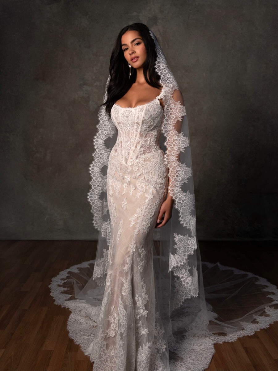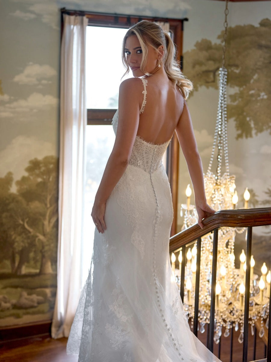 Style D4437 is a romantic revival of old-world elegance, blending vintage-inspired details with a refined silhouette. Crafted in lace and tulle, this fit-and-flare gown features a soft scooped neckline with lace-shaped straps and a structured bodice with corset boning for subtle definition. A delicate Chantilly lace underlay adds texture beneath matte floral lace appliqués, while the Basque waist elongates the frame with a nod to classic design. The look finishes with a scalloped lace-shaped train, offering a dramatic and graceful finish for the bride drawn to timeless craftsmanship and beauty. Also available in plus sizes.